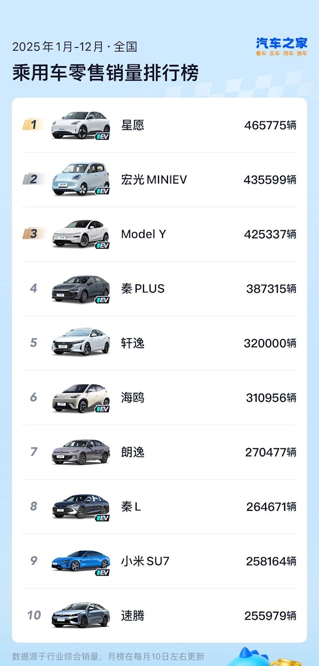 第六名至第十名分别为比亚迪海鸥(310956辆)、上汽大众朗逸(270477辆)、比亚迪秦L(264671辆)、小米SU7(258164辆)以及一汽-大众速腾(255979辆)。